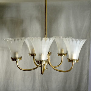 Ceiling lamp by Glössner, Sweden in brass and blasted glass. 1950's. Diam 63, height 75 cm. Takkrona,mässing,Wigerdals Värld
